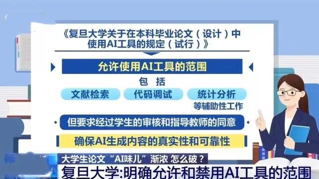 为应对这一问题,各高校纷纷出台AI工具使用规范。以复旦大学为例,该校发布了《复旦大学关于在本科毕业论文(设计)中使用AI工具的规定(试行)》,明确禁止使用AI工具的范围,包括研究设计与数据分析、原始数据收集、结果图片与重要插图创作等涉及原创性、创新性的内容。